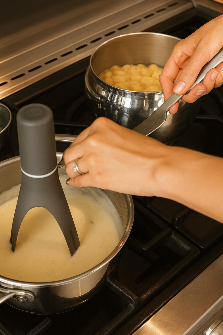 Odkryj nowoczesne urządzenie, które ułatwi gotowanie i pieczenie, automatycznie mieszając składniki w garnku. Po prostu włącz i ciesz się perfekcyjnymi sosami, kremami czy ciastem bez wysiłku!